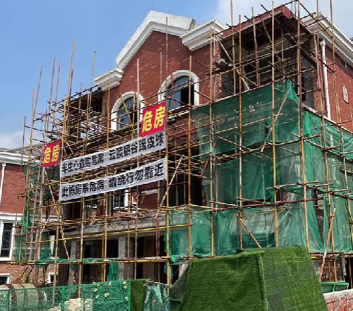 5月29日,记者在云顶栖谷小区41栋看到,房屋为3层,正面悬挂有“此栋系危房,请绕行勿靠近”“危房”等醒目字样。房屋外墙的脚手架未拆除,前坪空地上已长满杂草,现场还留有大量水泥、砂石等装修材料。房屋东西两侧外墙正在加装电梯井道,未完工。