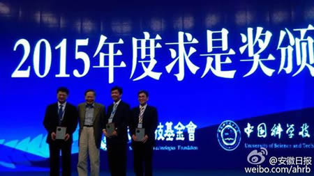 19日,2015求是颁奖典礼在中科大先进技术研究院举行,血液病专家、83岁的张亭栋教授获得“求是杰出科学家奖”。求是基金会创始人査济民长女查美龙以及顾问杨振宁、孙家栋、施一公等参加了此次庆典。