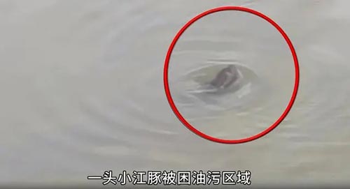 据报道,小江豚被发现后,由于当时没有救助条件,督察人员在专家的指导下,只能请相关工作人员进行驱离,引导小江豚游出油污区域。