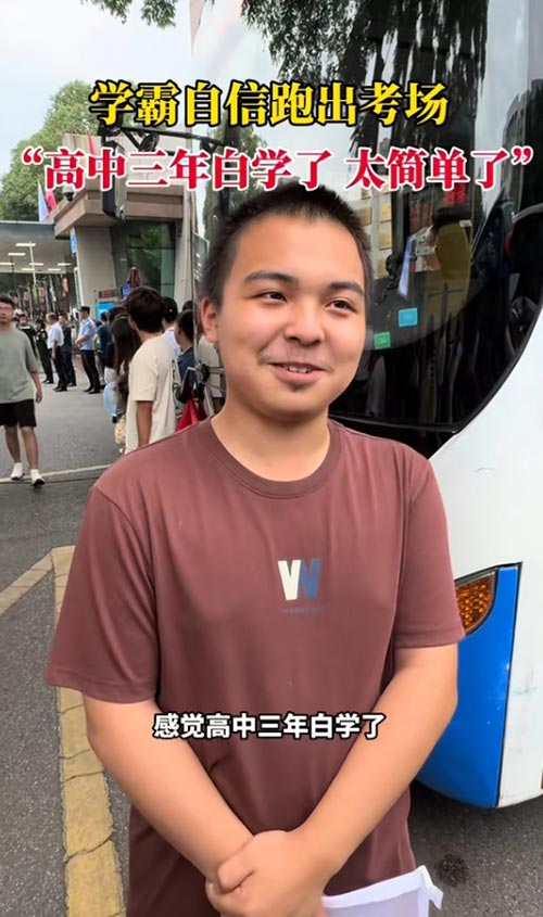 如果用一个词或一句话形容一下,这名考生自信放话:“感觉高中3年白学了,太简单了。”