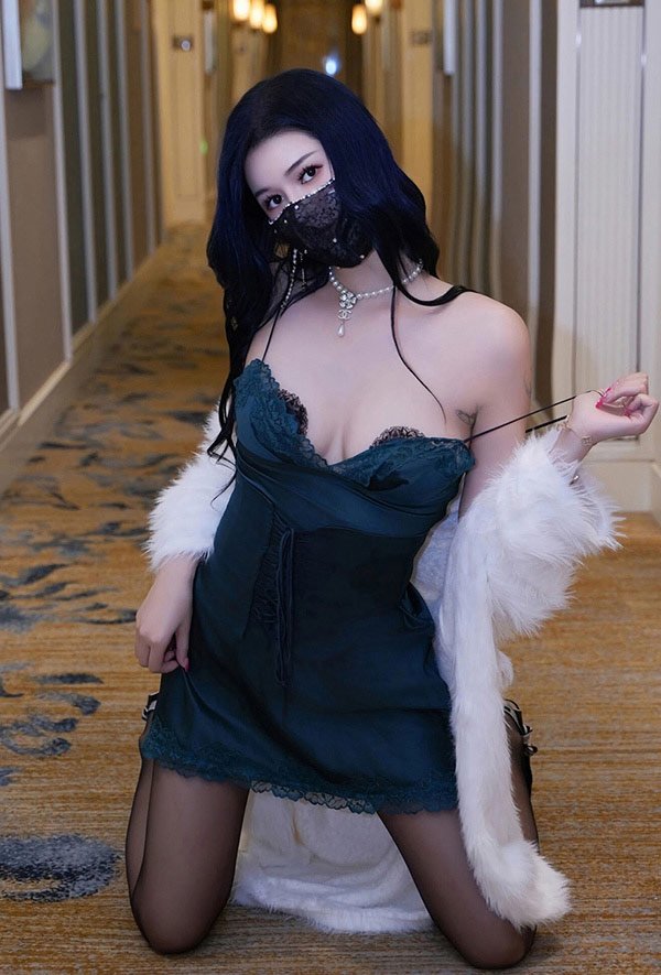 秀人女神芮芮蓝色吊带黑丝魅惑