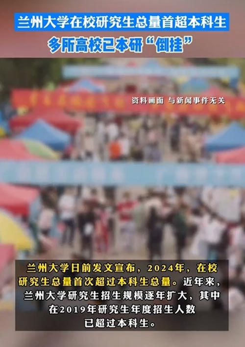 兰州大学日前发文宣布,2024年,在校研究生总量首次超过本科生总量。近年来,兰州大学研究生招生规模逐年扩大,其中在2019年研究生年度招生人数已超过本科生。