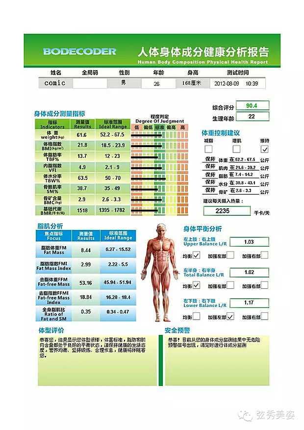 运动除了能减脂的无氧运动外,还有一类称为有氧运动或者力量练习,它主要的作用在于锻炼身体肌肉,更准确的说是锻炼我们身体的骨骼肌。使用体格大师测量身体骨骼肌含量,适当提高骨骼肌的所占比率,有助于保持身体的健康。
