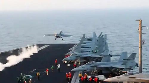 看视频和图片,大批美国战机从美国航母“杜鲁门号”上起飞,参与对胡塞武装的袭击;一些蘑菇云从也门城市升起,爆炸声接连不断。