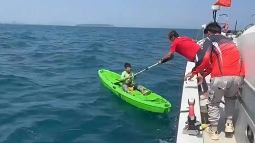 3月22日下午两点多,从事海钓服务工作的小杨,与同事、客人一起从三亚后海湾出发,前往海钓区钓鱼。在距离岸边10海里(约18.52公里)的海域,发现远处有一条绿色小船,上边有一个瘦小的身影。