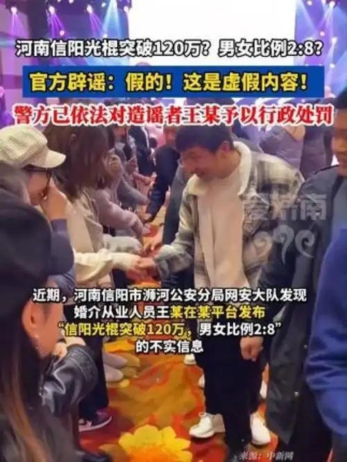 河南信阳市浉河公安分局微信公众号“平安狮河”4月7日消息,近期,浉河公安分局网安大队在工作中发现,婚介从业人员王某在某平台发布“信阳光棍突破120万,男女比例2:8”的不实信息。