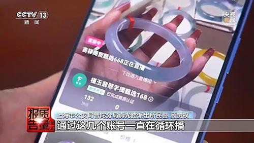 至此记者调查发现,为了牟取暴利,犯罪嫌疑人从玉石批发市场以低价大量购进经人工染色的石英岩玉,然后在网上订制假翡翠鉴定证书,在短视频平台开播,打着天然翡翠的名义将假玉镯高价销售给不知情的消费者。