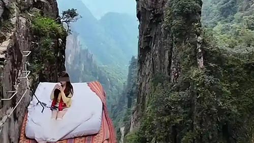 原标题:湖南一景区“悬崖睡床”引关注 景区:是打卡点不能过夜,参加者腰围不能超三尺