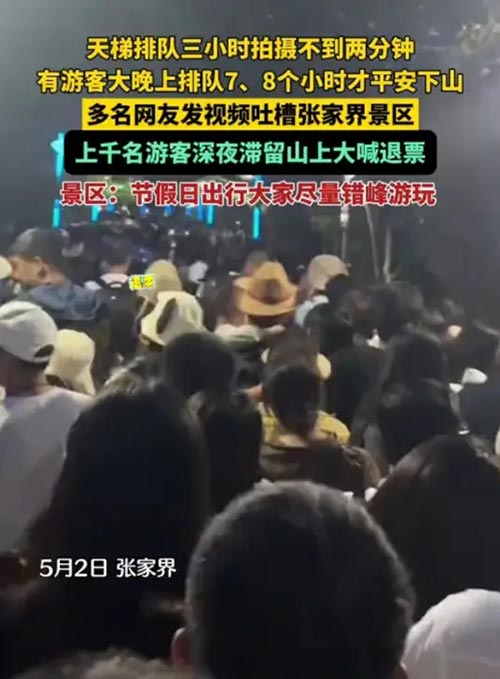 据澎湃新闻此前报道,5月2日,多名网友通过社交平台反映称,湖南张家界国家森林公园出现景区拥堵问题,天梯排队三小时拍摄不到两分钟,晚上排队七八个小时才下山,上千名游客深夜滞留山上大喊退票。