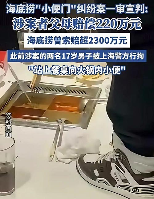 原标题:海底捞“小便门”相关纠纷案一审宣判:涉案者父母赔偿220万元