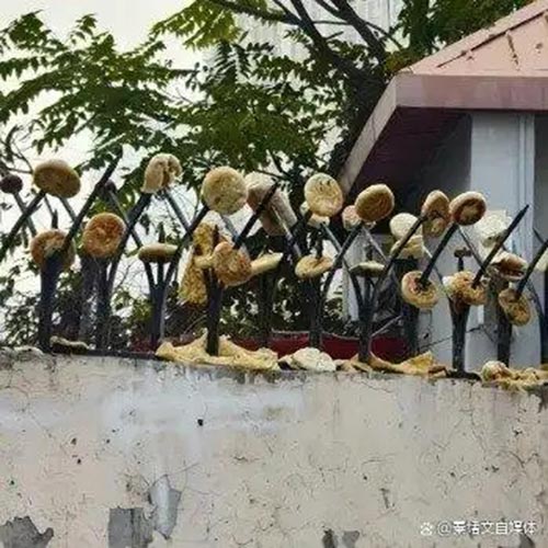 周边邻居后来才透露,这都是小区里一位大爷干的。他专门收集这些剩下的主食,往防盗刺上一插,借着风晾晒,等干透了就卖给回收站点,据说还能换点零花钱。