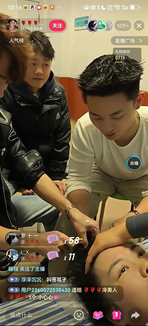 直播中,“冷美人”杨朝芹横躺在病床上,几位男士帮她梳理头发。