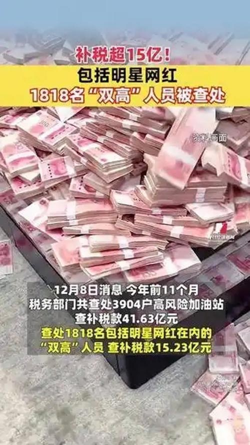12月8日,国家税务总局举行例行新闻发布会。政策法规司司长戴诗友表示,今年前11个月查处1818名包括明星网红在内的“双高”人员,查补税款15.23亿元。