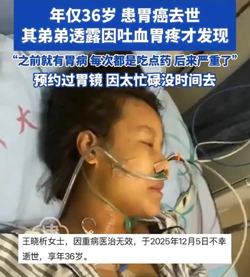 【#36岁电商女老板王晓析患胃癌去世#】12月9日(报道时间),7日,一位来自安徽的网友发布了一则讣告:“王晓析女士,因重病医治无效,于12月5日不幸逝世,年仅36岁。”据其首页视频显示,王晓析经营一家售卖袜子的电商店铺,经常在线上直播带货,平时工作十分忙碌。王晓析弟弟透露,姐姐是患胃癌去世,并在评论区回复网友称:“她之前就有胃病,每次都是吃点药,后来严重了。预约过胃镜,还没来得及去检查。因吐血胃疼的症状才发现。”