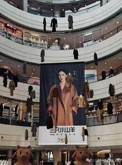 近日,有网友发帖反映,上海南京西路久光百货商场中庭悬挂着数十件长大衣,这些大衣悬挂高度不一,错落分布在整个中庭空间,中间是品牌代言人的巨幅海报,奇特的布置让不少网友直呼气氛诡异,有点吓人。