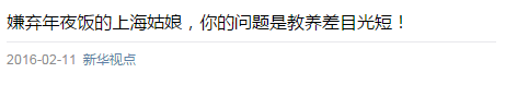 @何磊:我想说农村长大的都知道这些饭菜看起来都是这样的,也许看起来黑,但是我想说不是农村人不要随便就说脏!那些碗筷不脏,我现在也还是年年吃这样的。看不起穷人没关系,人家也没指望你什么。事件中的女的就是没教养,说难听是没家教,上海人的自大是全国闻名的!这对情侣分了也是对的,我只想说事中的男主角眼光才是差!这种女的我一开始就不会要!