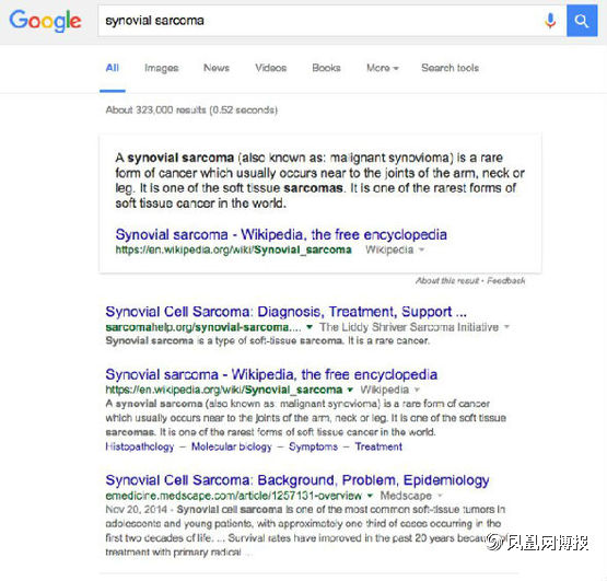 网上有人说在美国的网站搜索会有什么结果。于是娓娓也试着在谷歌搜索了“synovial sarcoma”(滑膜肉瘤),用时0.52秒,搜索到32.3万个结果,第一条结果是维基百科“synovial sarcoma”词条介绍,包括这个病的基本信息,第二条搜索结果是由一群医生自发建立的关于滑膜肉瘤的一个专业网站,上面都是一些相关的研究和治疗手段介绍,以及各方面的最新进展。