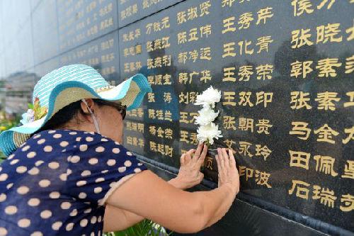 016年7月27日,一名唐山市民将白纸花粘附在遇难亲人的名字旁。