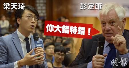 彭定康毫不客气地直斥,梁的看法是大错特错,他直言,不知道梁有何计划搞“港独”,“不过如果你觉得明年或再过两三年,就会推翻中央,令香港可以独立,我觉得你是自欺欺人。”他又揶揄梁,可继续就“港独”议题雄辩滔滔,赢取掌声,但这不是好主意。