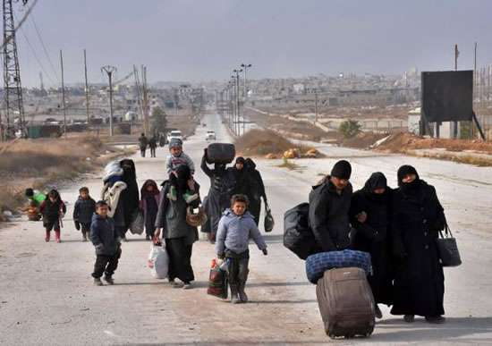 11月27日,难民乘坐公交车从叙利亚城市阿勒颇东部撤离。