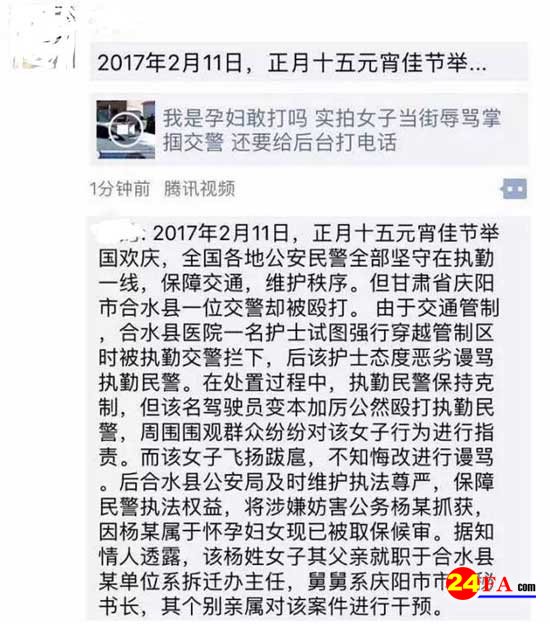 据了解,昨日是元宵节,按照合水县当地习俗,每年县里都要组织各乡镇的民间艺人到县上表演传统民间艺术——“社火”。为举办“社火”,当日全城实行交通管制,被袭交警豆某就是在执勤过程中与杨姓女子发生了口角冲突。