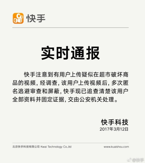 ?19时34分,“快手直播”官方微博发布《实时通报》,通报称,快手注意到有用户疑似在超市破坏商品的视频,经调查,该用户上传视频后,多次匿名逃避审查和屏蔽,快手现已追查清楚该用户全部资料并固定证据,交由公安机关处理。