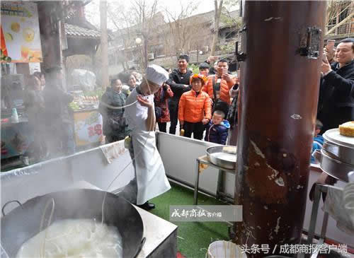 3月20日下午,黄龙溪景区,“古镇一根面”面馆门口,在动感音乐伴奏下,一名“拉面小哥”舞动身体拉面,吸引顾客。