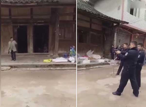 目击者拍摄的现场视频显示,一间木屋前,一男子手持菜刀站立,不远处一民警双手持手枪与该男子对话,持枪民警旁还有两名民警,一人持盾牌一人持钢叉。剪辑后的画面显示,持菜刀男子瘫倒在地上,周围许多围观群众。视频结尾处,民警在现场拉起了警戒线。