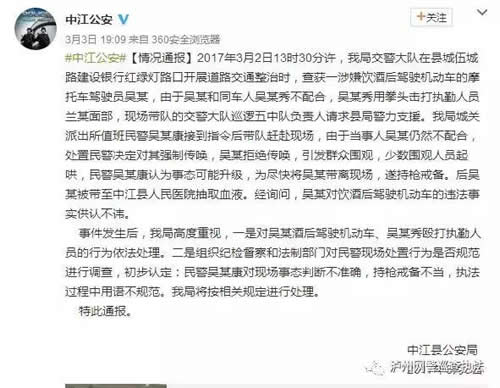 此视频为2017年3月2日13时30分许,中江公安交警大队在县城伍城路建设银行红绿灯路口开展道路交通整治发生的事件,并非泸州太伏处置现场视频。对此,@中江公安于3月3日对此事进行了通报。