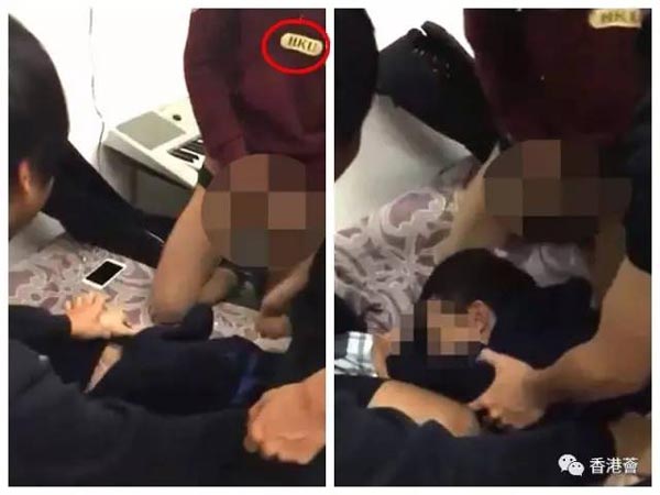 香港东方日报网称,一段非常露骨的视频5日在网上流传。片长约19秒,视频中可见有一名男生被数名男生按压在床上,另一名身穿印有HKU(香港大学)字样的深红色卫衣的男生,用生殖器打向被按压男生的头部后方,动作猥琐。其间不断传出多名男子发出的猥亵声音,更拍摄到欺凌者大笑的神情。被欺凌的男生不断挣扎,尝试用左手遮住自己的头部后方,但被身旁男生拨开。