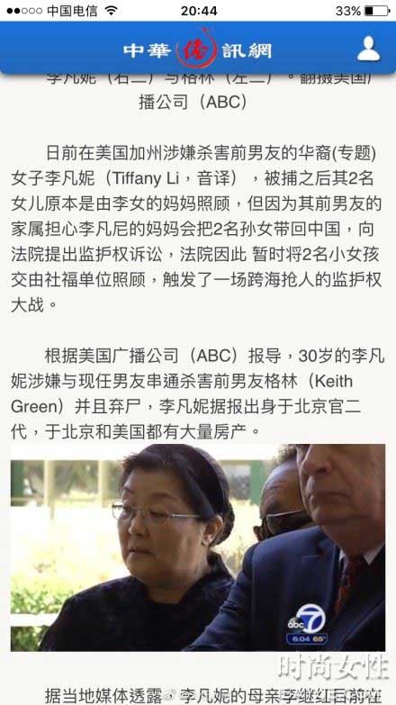 (本报讯) 涉嫌谋杀前男友凯斯.格林(Keith Green)的华裔女子李凡尼(Tiffany Li)家庭背景逐步明朗,据悉,李凡尼来自中国一个权贵家庭,其母李某为中国军区某高层之女,现在中美两地注册有多家房地产公司并持有多所房产。另外据微博网友曝料称,李凡尼系解放军上将李续耐的外甥女。