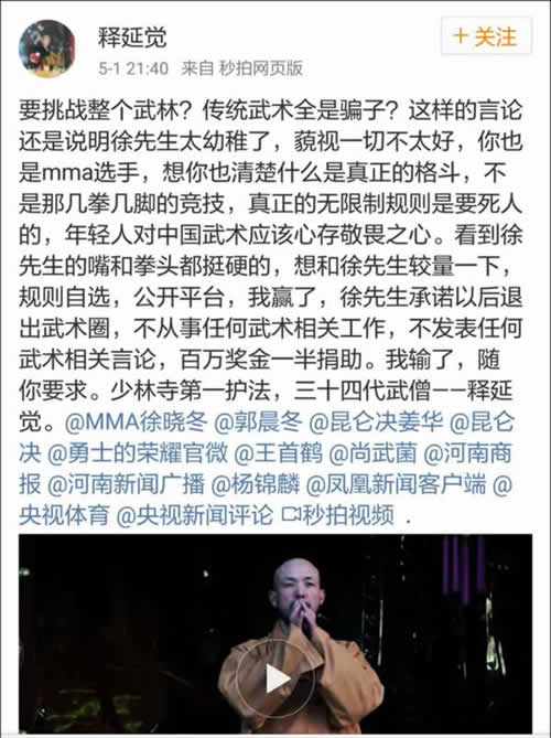 昨日(5月1日),微博介绍为少林寺第一护法武僧、第三十四代武僧的释延觉,就在微博上公开向徐晓冬下战书,称“要挑战整个武林?传统武术全是骗子?这样的言论还是说明徐先生太幼稚了”。“年轻人对中国武术应该心存敬畏之心。看到徐先生的嘴和拳头都挺硬的,想和徐先生较量一下”。