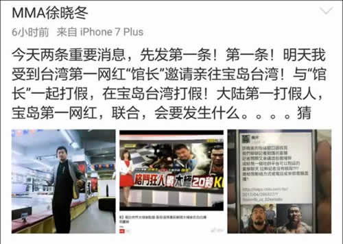 截止目前,徐晓冬尚未有正式回复,最近的一条微博显示,他刚刚接受了台湾第一网红“馆长”邀请亲往宝岛台湾,与其一同打假。
