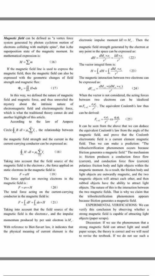 比如说:传统的教科书都告诉我们,摩擦产生了电荷,电荷产生了静电场,静电场是单极场,这其实完全是错的,摩擦产生的是偶极磁场,根本不是单极场,所以,传统的教科书说那些,根本就是在误导学生。这些实验细节都经受了约瑟夫森教授的审核的。
