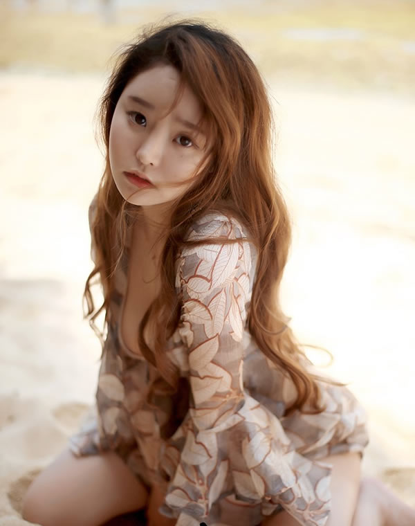 风情万种柳侑绮旅拍美胸激凸浅咖色连衣裙福利写真