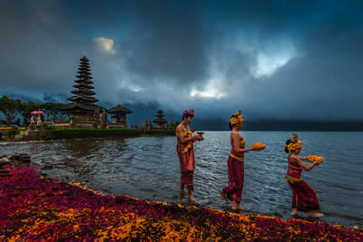 早晨的布拉坦湖神庙,美得就是一幅画。偶尔飘来的山风,变化莫测的光线,都让它充满神秘的韵味与色彩。特别是祈福的印尼女人,身着艳丽的民族服装,踩着有点冷的湖水,扭动着婀娜多姿的身躯,像天女一般在祈祷和散花。游客可以站在湖岸上,用不同的角度,欣赏这座水神庙和印尼美女在水一方的美丽姿态。
