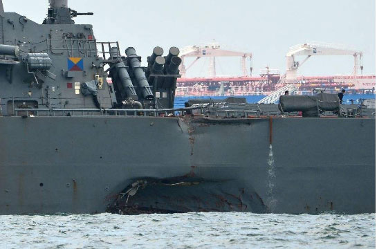 据海外网此前报道,美国于北京时间21日早上7点24分在新加坡东部和马六甲海峡附近与一艘商船Alnic MC发生碰撞。初步报告显示,“麦凯恩”号驱逐舰左舷受损,船的左后方。据悉,商船Alnic MC是一艘600英尺长的石油和化学品运输船,总吨位为3万吨。事件造成驱逐舰上10名成员失踪,5人受伤。