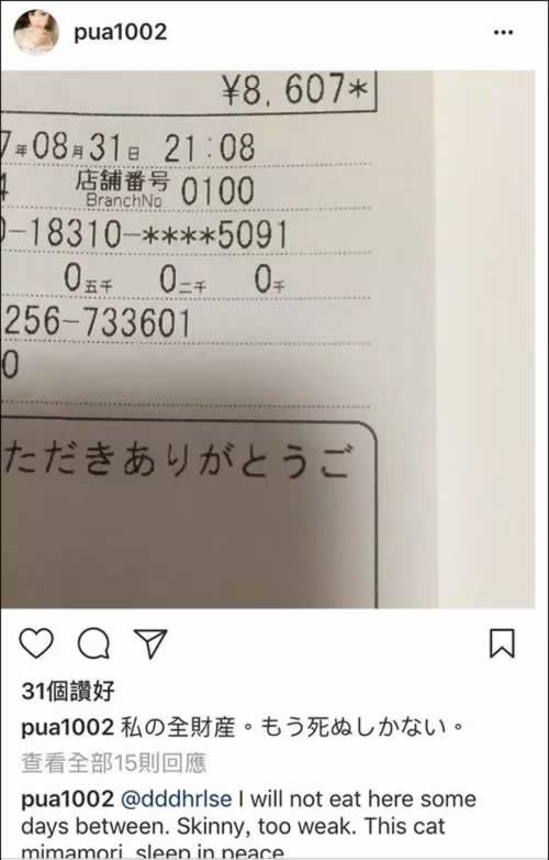 从她的instagram截图来看,导致她本次直播自杀的动机有两个:1、生活拮据到了无法继续下去的地步,存款只剩不到9000日元(约合人民币540元)。