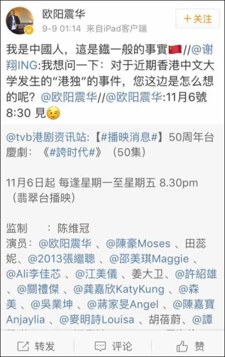 9日,有网友就此事询问香港著名演员欧阳震华的看法,欧阳震华正面回答说:“我是一个中国人,这是铁一般的事实”。