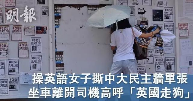 随后一名白衣女子突然大幅度撕走“民主墙”上的标语,正在当值的学生会外务秘书李文耀即上前阻止并询问身份,这名女子未有响应,其后乘坐私人座驾离开。约2分钟后,其座驾驶回现场,司机开窗并大叫“英国走狗”。