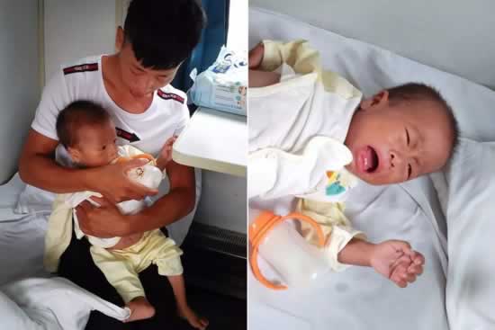 图为列车上的小肉肉在喝奶。