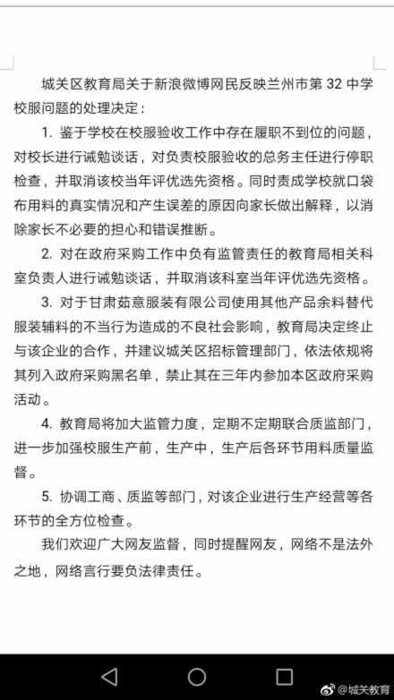 (原标题:城关区教育局关于新浪微博网民反映兰州市第32中学校服问题的情况说明)