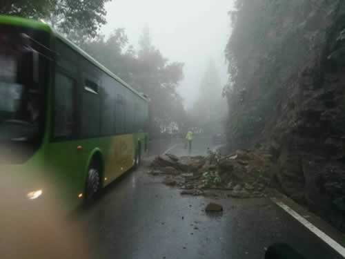 当日上午7时,景区紫霄十八盘路段有一处山体塌方,巡逻交警迅速设置警示标志并组织人员进行清理。上午10点,逍遥谷龙泉观路段出现一处山体塌方,当时正值车辆通行高峰,巡逻民警在道路两边设置警示标志,通过对讲系统提示旅游大巴司机减速慢行,并指挥过往车辆安全通行。