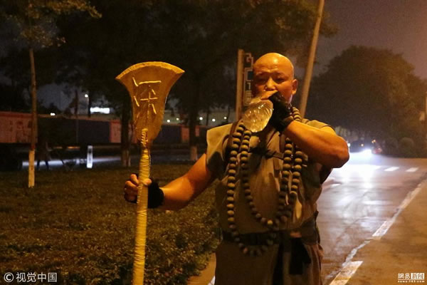 5斤重的佛珠、62斤重的月牙铲、用来吟诵佛经的音响、一瓶2升装的水,绕着马路折返走十公里,步速非常快,近乎常人的小跑速度,摄影师跟在一旁都要停停走走,而马志军只在途中停下来两次喝水。路旁的行人都好奇的围观着这像鲁智深一样的壮汉和尚。