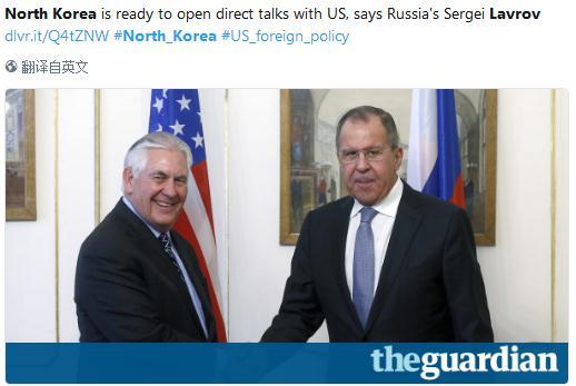 英国《卫报》12月8日报道称,俄罗斯外交部长拉夫罗夫向美国国务卿蒂勒森转达了朝鲜方面的信息称,朝鲜同美国就“核僵局”进行“直接对话”的大门是打开的,并且向华盛顿寻求安全保证。
