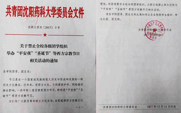 共青团沈阳药科大学日前发布通知,禁止该校各级组织举办与“平安夜”、“圣诞节”等西方宗教节日相关的活动。