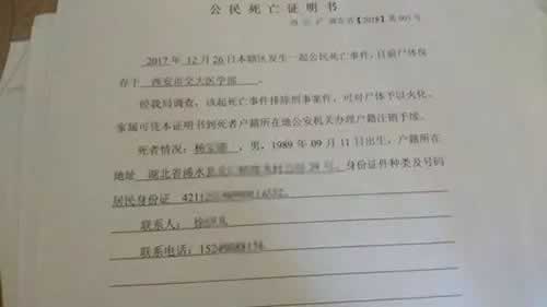 2017年12月26日,西安交通大学在读博士研究生杨宝德被发现溺亡在西安灞河中。警方出具的“公民死亡证明书”显示,没有证据证明是刑事案件。