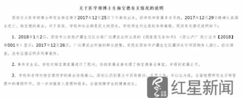 随后,红星新闻从西安交通大学新闻中心得到了一份“关于医学部博士生杨宝德有关情况的说明”。