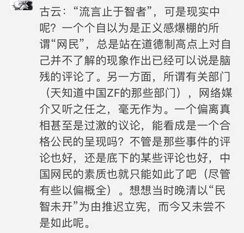 网上偏激的人、偏激的文太多,难得有人冷静清醒!上天给人两只眼睛,一张嘴,就是希望我们在妄加评论之前,用真相之眼,和睿智之手来,好好的审视自己,什么才是底线!