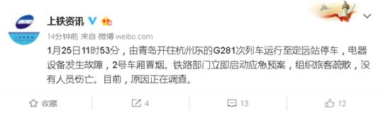 1月25日11时53分,由青岛开往杭州东的G281次列车运行至定远站停车,电器设备发生故障,2号车厢冒烟。铁路部门立即启动应急预案,组织旅客疏散,没有人员伤亡。目前,原因正在调查。